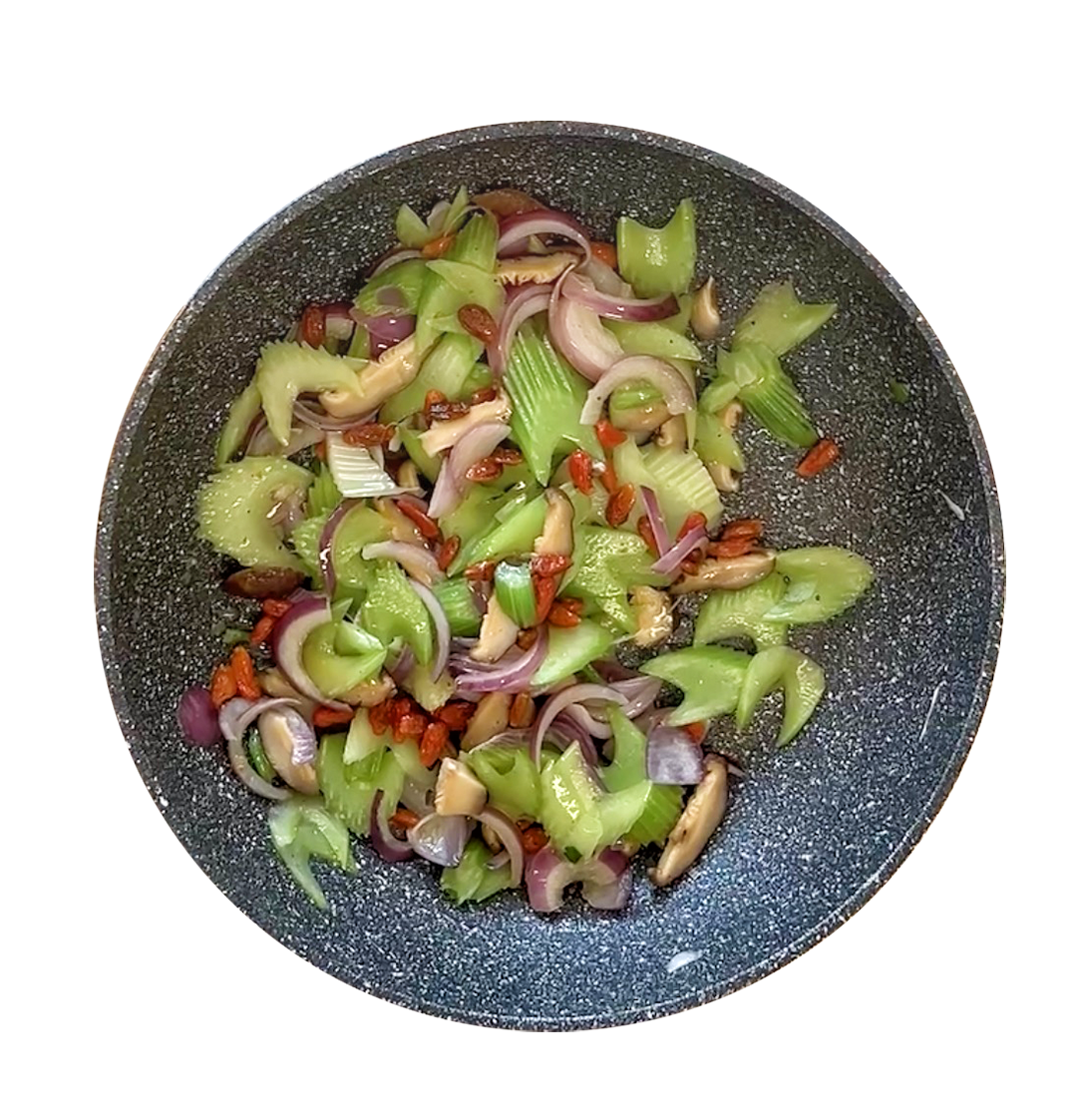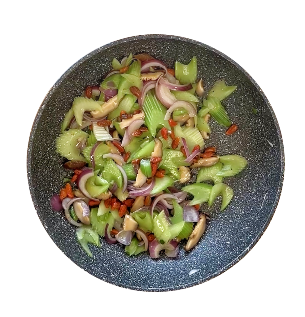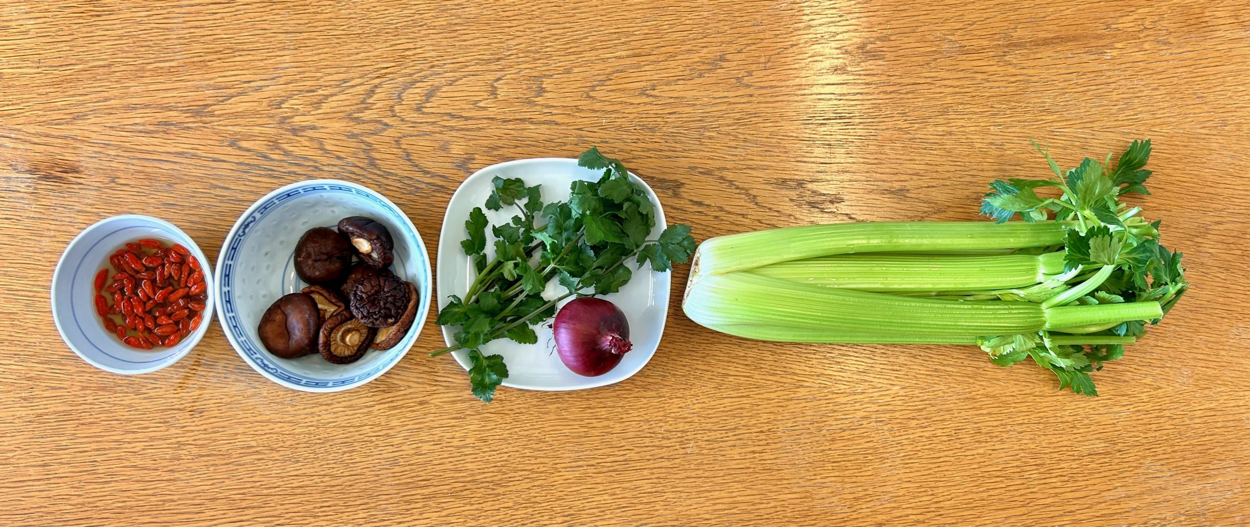 Le céleri-branche stimule la circulation de l’énergie et détend l’énergie du Foie. Cela peut aider à détendre les personnes qui sont facilement contrariées. Le champignon parfumé est de nature neutre et douce; il harmonise le Foie et l’Estomac.