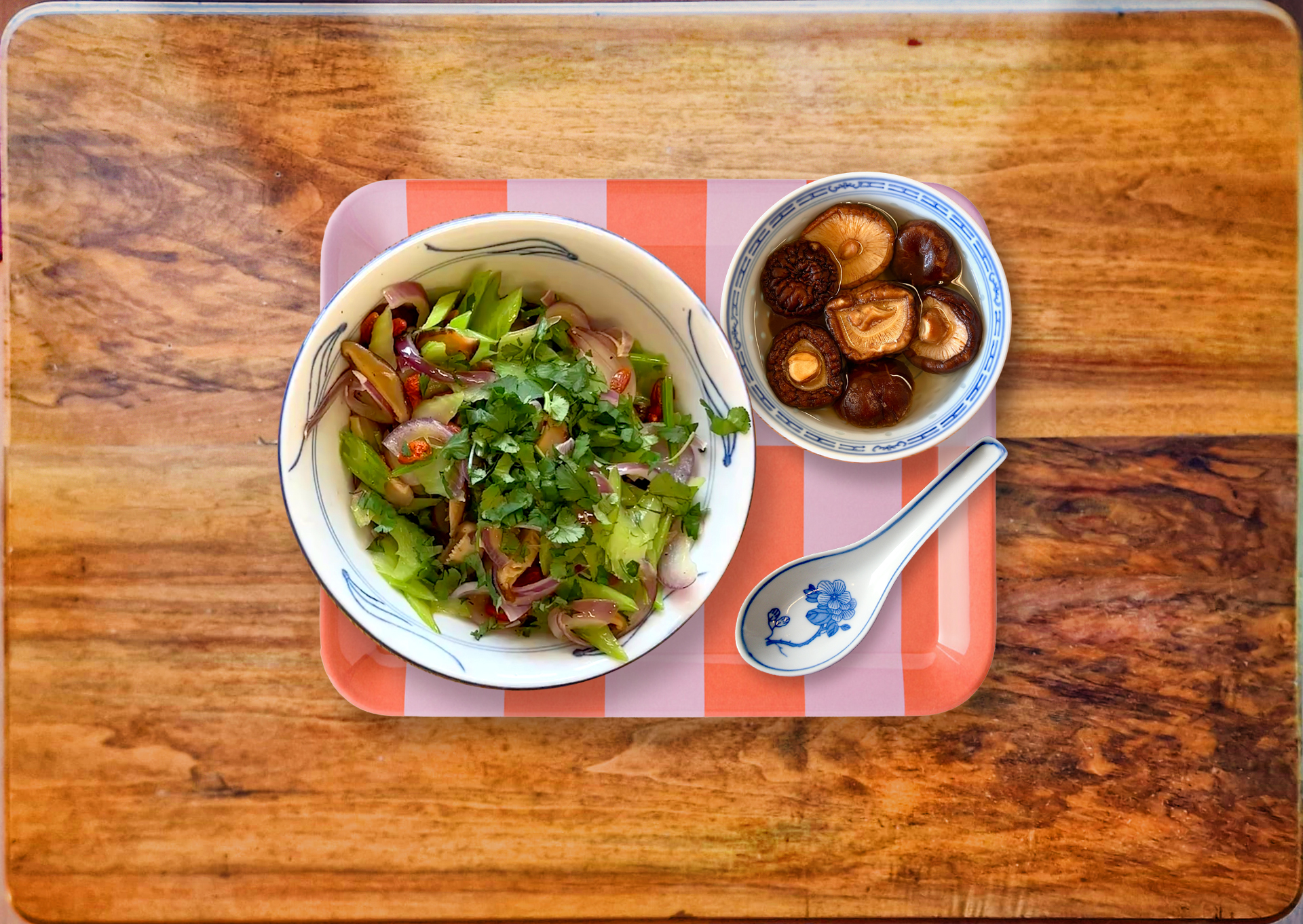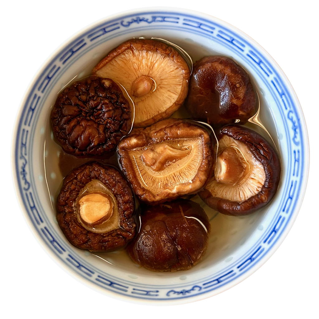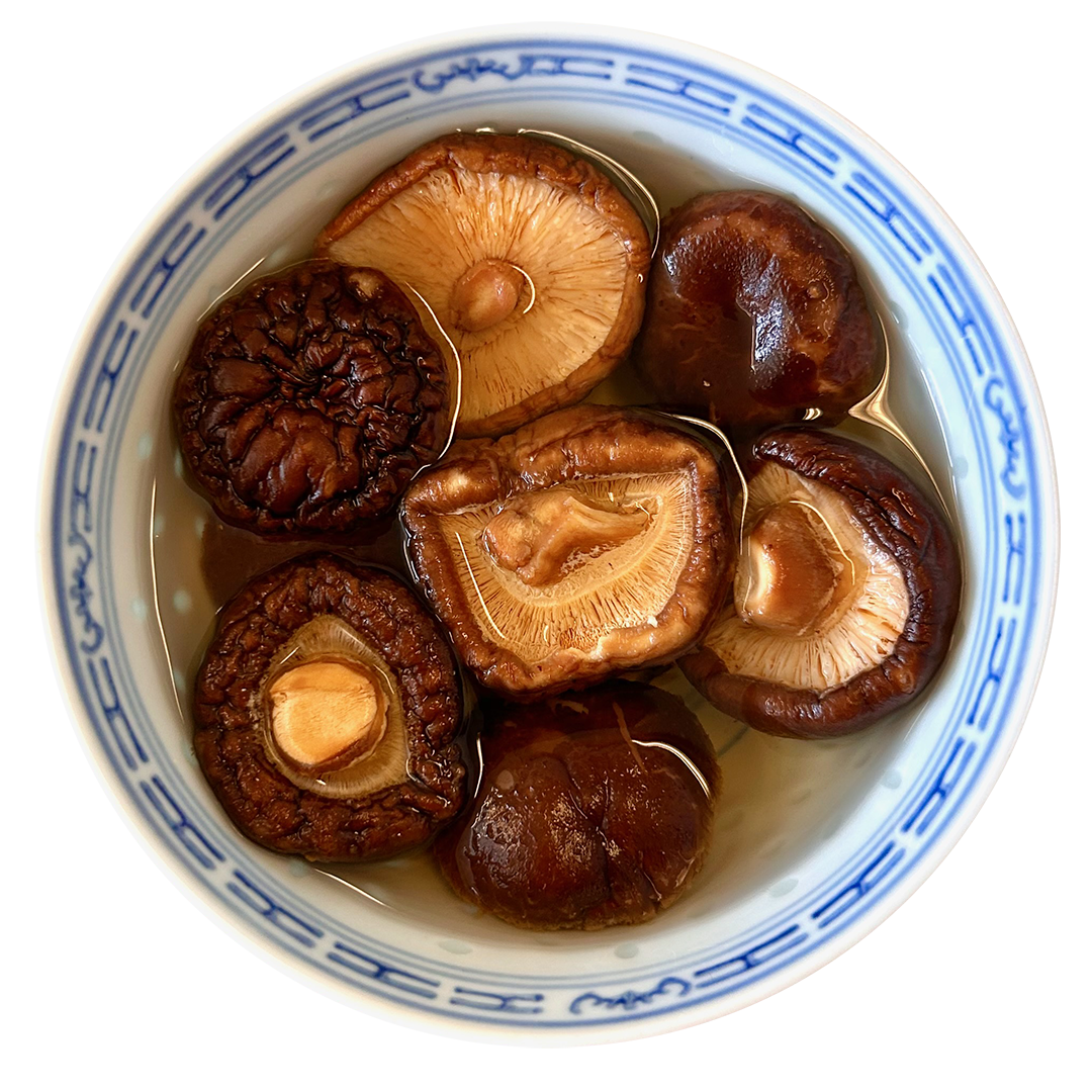 - Tremper et réhydrater les champignon shiitaké (Xianggu en chinois) pendant 30 minutes et conserver ensuite l’eau de trempage